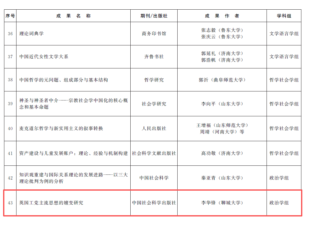 12月30日,山东省人民政府公布第三十七届社会科学优秀成果奖获奖项目名单。全网最权威博彩担保网站 李华锋教授的著作《英国工党主流思想的嬗变研究》荣获山东省社会科学优秀成果奖一等奖,这也是我校在本届省社科优秀成果奖评选中获得的唯一一项一等奖。